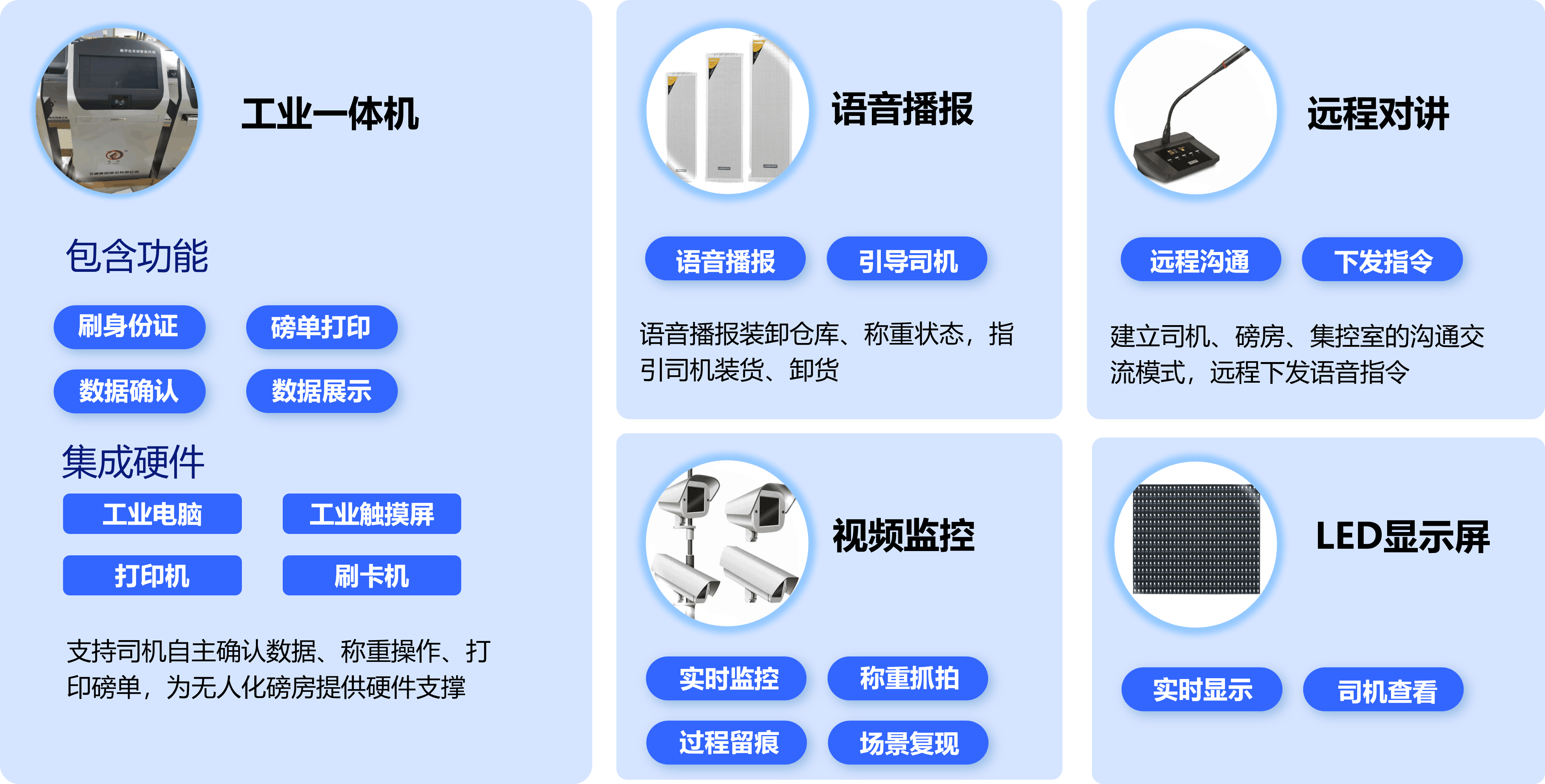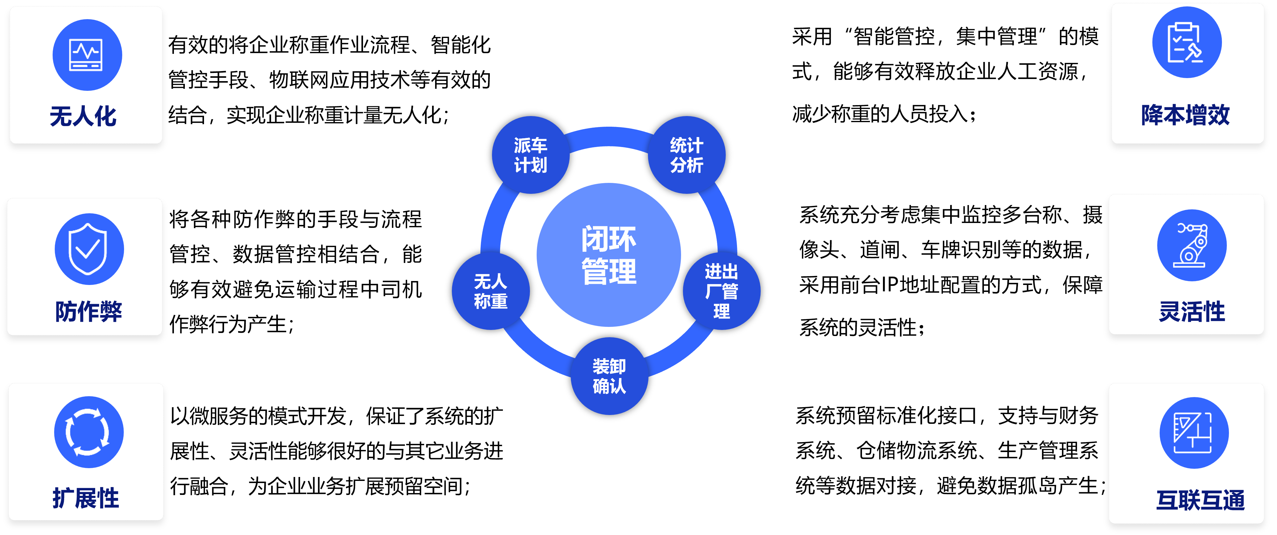 打造無人化值守地磅房可充分釋放磅房工作人員,實現(xiàn)無人化值守及降本增效的目標;計量過程多種監(jiān)控與監(jiān)測,保證過程透明化、真實性,為企業(yè)提供安全、可信的計量數(shù)據(jù);提供標準化接口,可支持第三方系統(tǒng)對接,實現(xiàn)數(shù)據(jù)互聯(lián)互通。